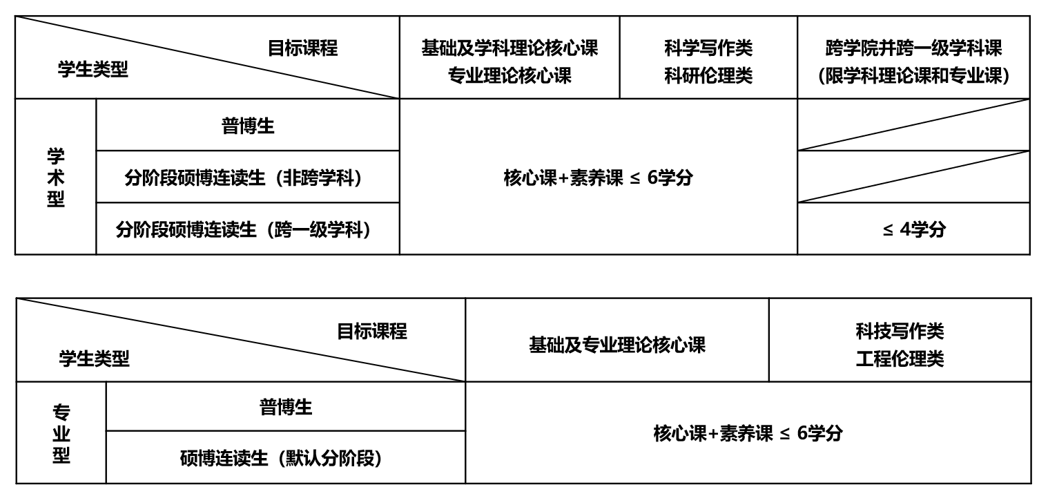 6. 普博生和选择分阶段培养的硕博连读生可申请认定的目标课程范围及学分上限如下表所示。课程认定应满足同质课程的要求(原课程和目标课程内容相同或相近,学时相当,原课程质量不低于目标课程)。