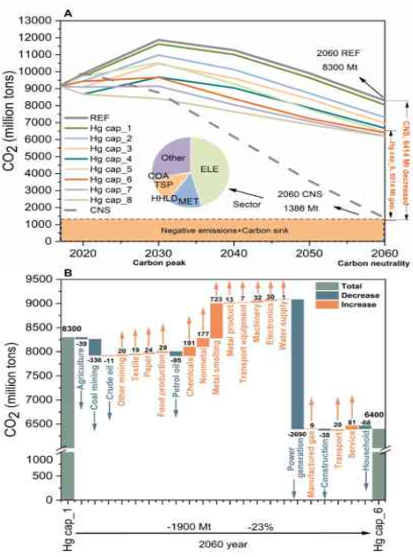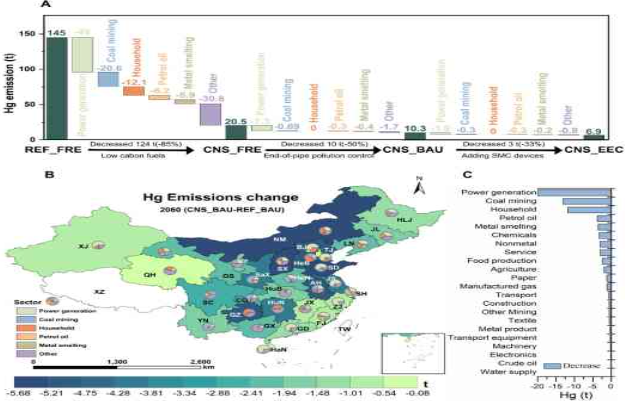 从全国尺度来看,实施碳中和政策,将使中国燃煤相关部门的大气汞排放基本实现近零排放,2060年碳中和情景将比基准情景减少85%的大气汞排放。就区域而言,2060年的内蒙古、山西、山东和安徽四省的汞减排量相当于全国总排放量的30%。对于部门,煤电行业、煤炭开采和金属冶炼行业的汞减排量占全国总排放量的69%。