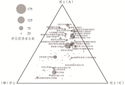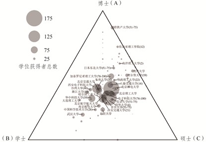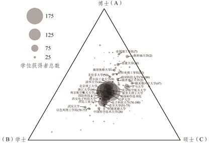 图3 航空航天工程领域授予学位的院校分布三元图