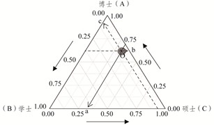 本研究通过绘制三元图的方法直观呈现院校间研究生流动的总体状况。三元图是重心图的一种,主要是通过构建等边三角形坐标系来描述三个变量的相对比例关系,其中各变量的数值要标准化为0-1,使得三个变量之和为1[7]。为绘制三元图,研究对作者简历信息作如下处理: