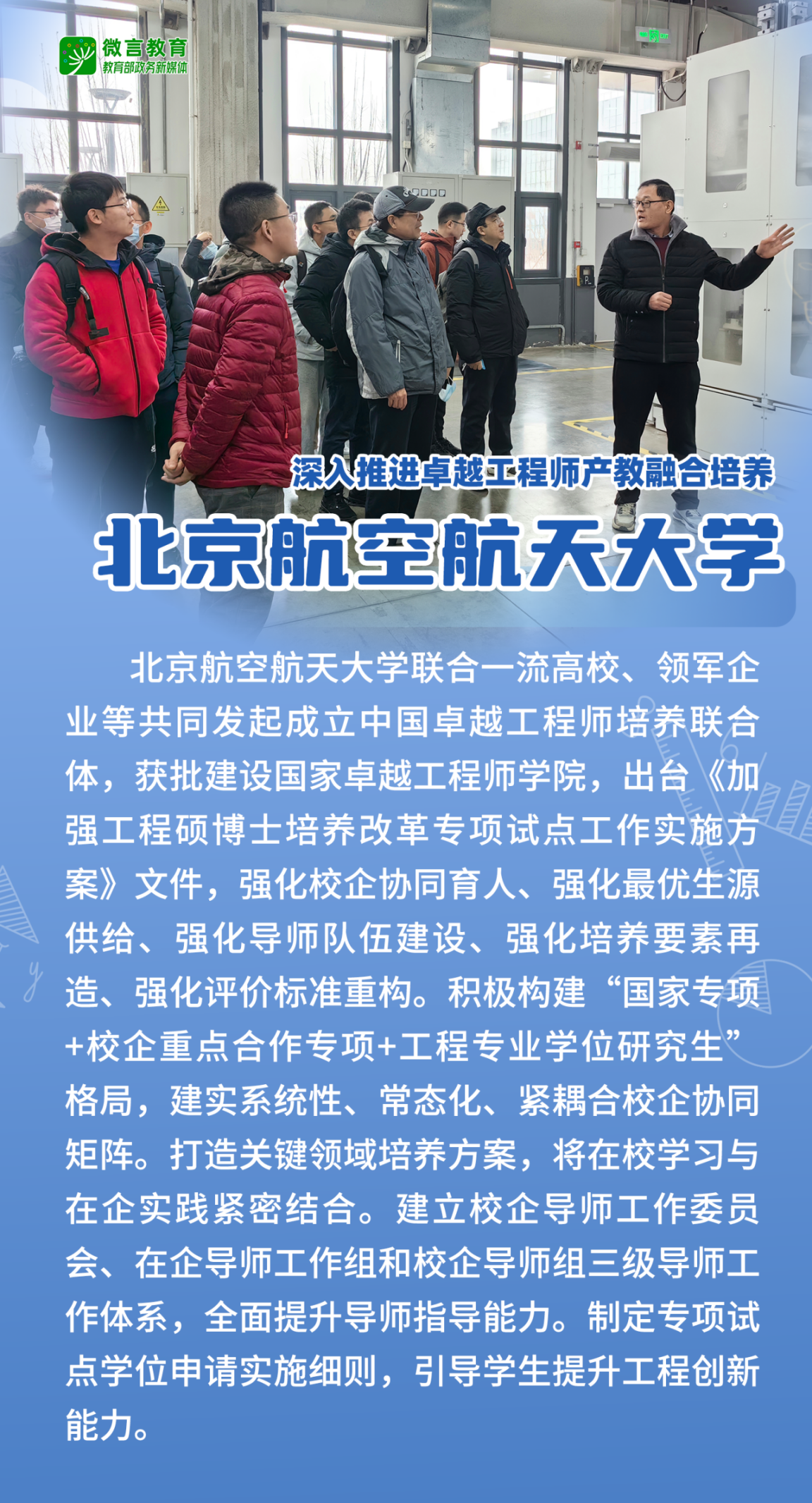 联合清华大学、航天科工、中国电科等单位共同发起成立中国卓越工程师培养联合体(北航为首届理事长单位、秘书处单位),获批教育部卓越工程师产教联合培养研究基地(全国八个),积极构建“国家专项+校企重点合作专项+工程专业学位研究生”格局。出台《加强工程硕博士培养改革专项试点工作实施方案》。
