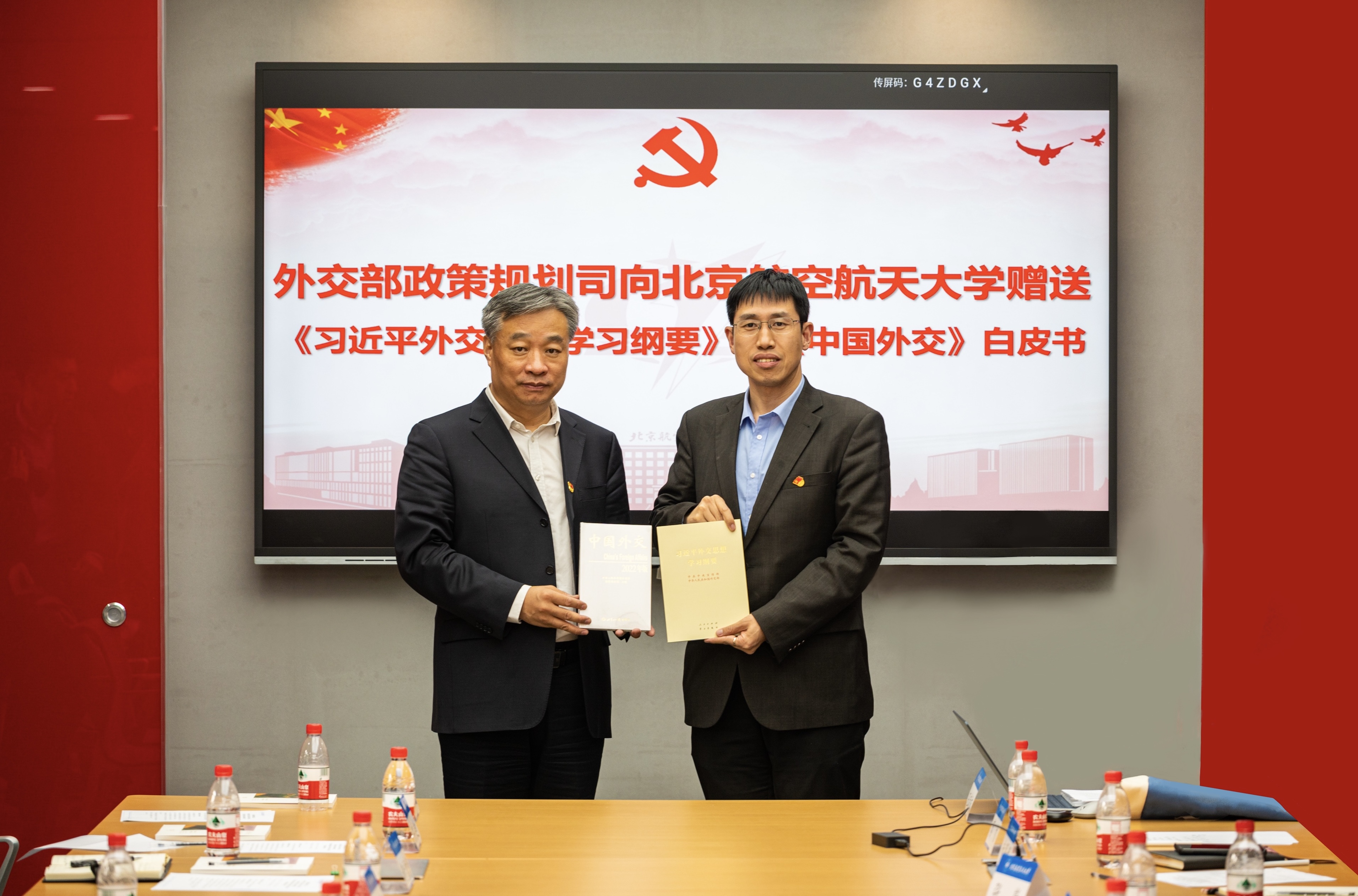 苗得雨一行向我校赠送了《习近平外交思想学习纲要》和《中国外交》白皮书(2022年版)等学习资料。