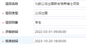 预申报审核通过后,博士生根据研究院审核结果直接填报“北航公派出国联合培养博士项目”(如下图),请于10月20日前完成申报及审核(导师在线审核完,如无需专家组评审,学院教秘可操作跳过,接着学院副书记、教秘完成在线审核)。已经完成预申报流程的博士生可直接填报“联合培养博士项目”。